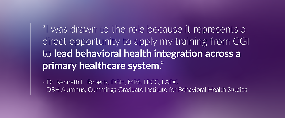 Cummings Graduate Institute for Behavioral Health Studies (CGI) is proud to celebrate the achievements of Dr. Kenneth L. Roberts, a Doctor of Behavioral Health (DBH) alumnus who has recently stepped into a key leadership role as the new Director of Behavioral Health at a Federally Qualified Health Center in Washington, D.C. For Dr. Roberts, this position is far more than a title, it represents the culmination of years of dedicated preparation and an opportunity to advance behavioral health integration in one of the communities that needs it most.