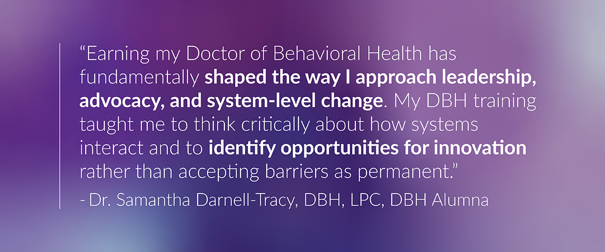 “Earning my Doctor of Behavioral Health has fundamentally shaped the way I approach leadership, advocacy, and system-level change,” she explained. “My DBH training taught me to think critically about how systems interact and to identify opportunities for innovation rather than accepting barriers as permanent.”